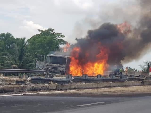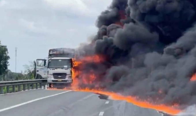 Khi qua nút giao Tân An đến địa phận tỉnh Tiền Giang thì xe bất ngờ gặp sự cố và bốc cháy dữ dội, toàn bộ nhiên liệu trên xe tràn xuống đường khiến cháy lan rộng, kéo dài hàng trăm mét.