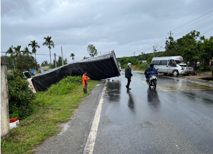 Xe tải đối đầu xe khách, lật nghiêng xuống đường 1 người bị thương