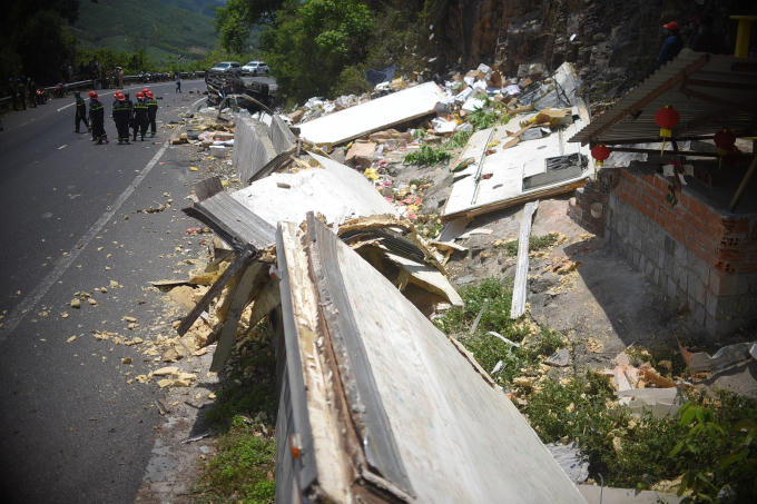 Hiện trường cho thấy, ô tô tải sau khi mất lái đã đâm vào dải phân cách trước khi lao thẳng về một miếu thờ do người dân dựng sát vách núi đèo Cù Mông. Cú tông va rất mạnh vào vách núi khiến đầu, thân xe và thùng hàng đông lạnh (chủ yến chứa các loại thức phẩm thủy hải sản tươi sống) biến dạng hoàn toàn.