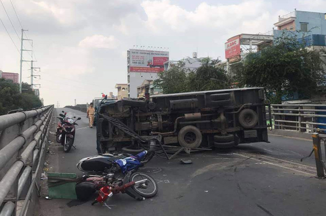 Lúc vừa lên cầu được 200 mét, xe tải bất ngờ mất lái, tông vào dải phân cách và lao sang bên kia đường, đâm 2 xe máy đang di chuyển rồi lật nghiêng giữa cầu.