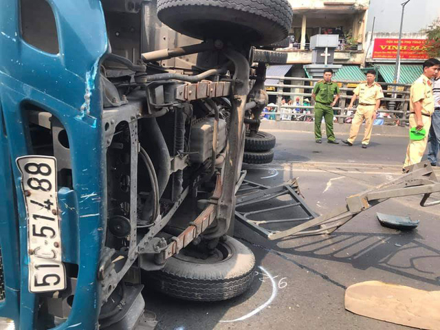 | Xe tải lật nghiêng sau vụ va chạm. |
