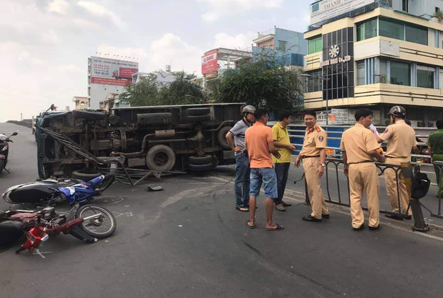 Tại hiện trường, xe tải lật nghiêng, chiếm gần hết mặt đường, hơn chục mét dải phân cách bị húc văng, 2 xe máy bị hư hỏng.