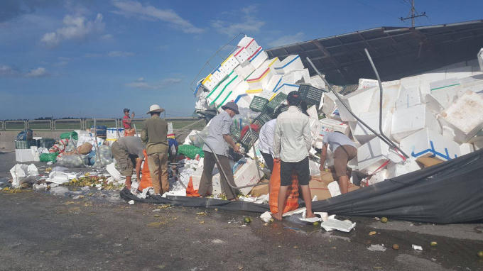 Tại hiện trường, phần đầu xe bị hư hỏng nghiêm trọng, toàn bộ kính lái xe bị vỡ nát. Phần thùng xe lật đè lên dải phân cách, hư hỏng khiến nhiều tấn hoa quả tràn ra đường, hư hỏng nặng. May mắn tài xế và phụ xe trong vụ tai nạn chỉ bị xây xước nhẹ. Phát hiện sự việc, người dân cũng giúp tài xế gom những thùng hoa quả bị đổ ra đường.