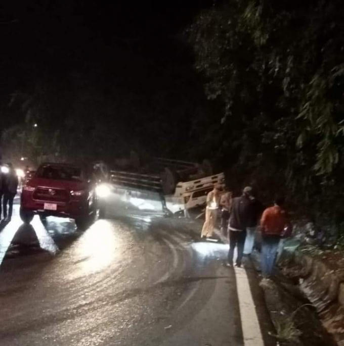 Sau khi tông trúng xe máy, xe tải lao về phía trước tông sập dãy lan can phòng hộ đèo rồi quay đầu lật ngửa ra giữa đường.