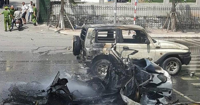 Người điều khiển xe máy bị áp lực vụ nổ nên bị hất văng khỏi xe, tử vong ngay tại chỗ. Vụ nổ gây cháy cũng làm 01 chiếc ô tô vừa chạy tới nơi bị cháy theo.
