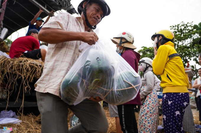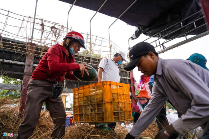 Ngoài khách mua lẻ, nhiều người thuê xe ba gác, xe tải lớn đến mua hàng tấn dưa về làm từ thiện hoặc bán không lợi nhuận. Bên cạnh hàng dài người đứng chờ giữa nắng là những chiếc xe chờ đến lượt lấy dưa hấu về.