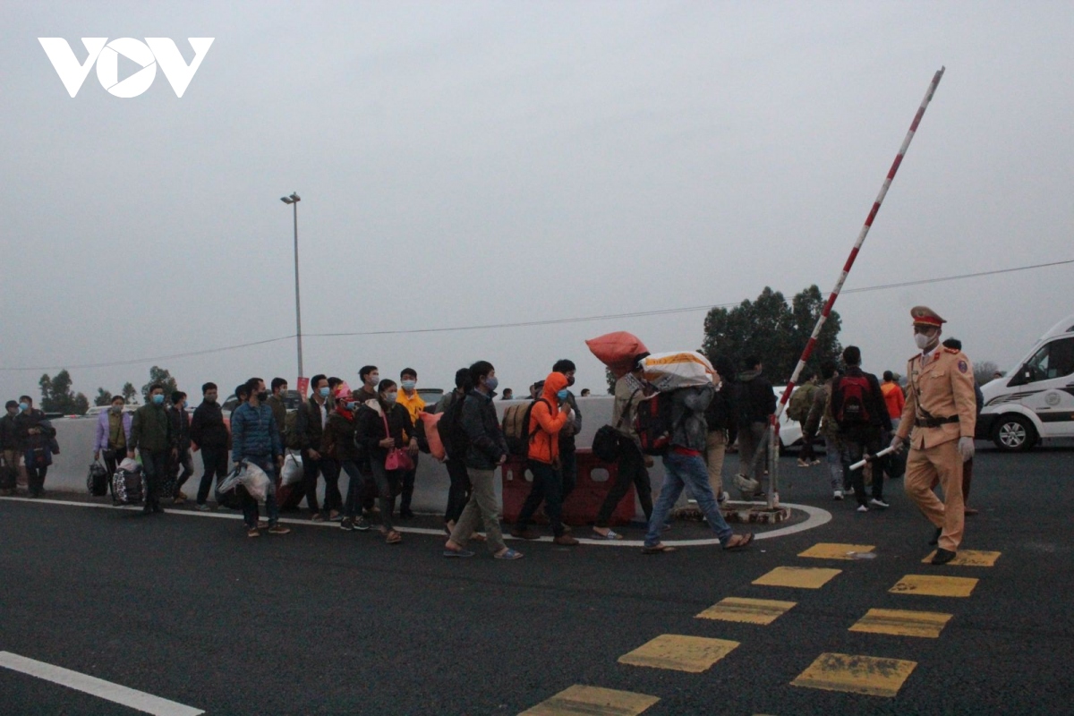 Tại chốt cầu Bạch Đằng trên cao tốc Hạ Long- Hải Phòng chiều 29/1, từng dòng người “tay xách nách mang” để tìm cách về nhà ăn Tết