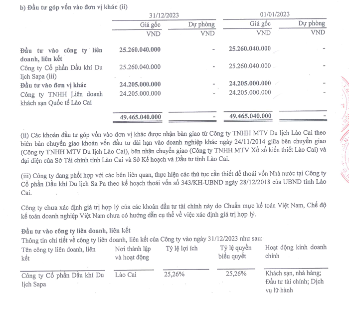 Liên quan đến những khoản đầu tư nói trên, tại báo cáo tài chính năm 2023 đã kiểm toán, Xổ số kiến thiết Lào Cai cho biết đã đầu tư vào vào Công ty Cổ phần Dầu khí Du lịch Sapa (công ty liên doanh, liên kết) tại thời điểm 31/12/2023 với trị giá hơn 25,26 tỷ đồng – tương ứng tỷ lệ lợi ích và tỷ lệ quyền biểu quyết tại đây là 25,26%.