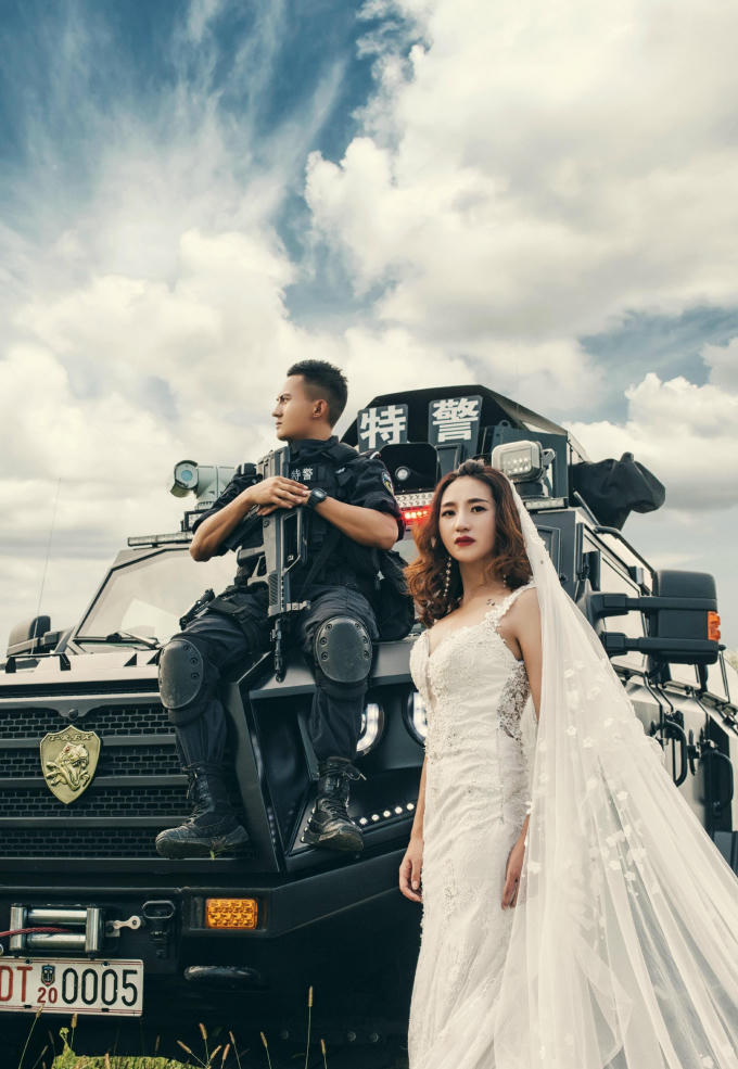 Cặp đôi đã tận dụng xe cảnh sát đặc nhiệm cùng các đồng đội của anh Ma Junwen làm khung cảnh để thực hiện được một bộ ảnh cưới tuyệt đẹp độc nhất vô nhị.
