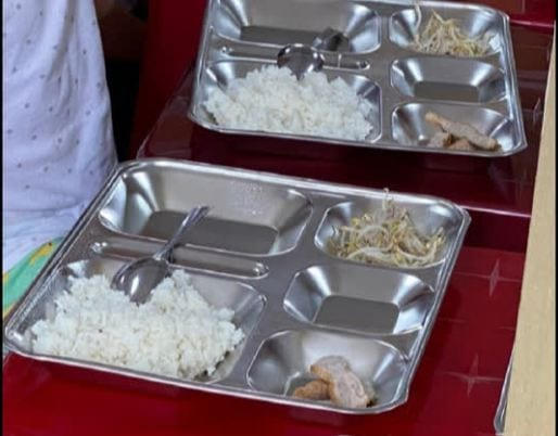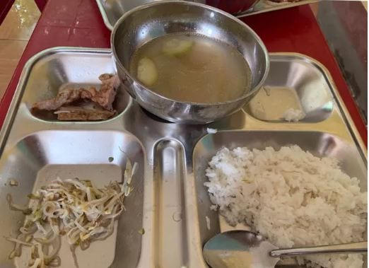 Theo đó, nhìn vào bức ảnh có thể thấy, khay thức ăn có 5 khoang nhưng 2 khoang để trống, những khoang còn lại đựng khoảng một bát cơm, khoang thứ 2 đựng đúng 3 lát chả cá khá mỏng, khoang còn lại đựng ít giá xào dính mỡ (có khay xuất hiện "mờ ảo" miếng thịt "siêu nhỏ"); kèm theo đó mỗi học sinh có một bát canh với 2 lát bí đao xắt mỏng "trôi dạt" trong "mênh mông" nước.