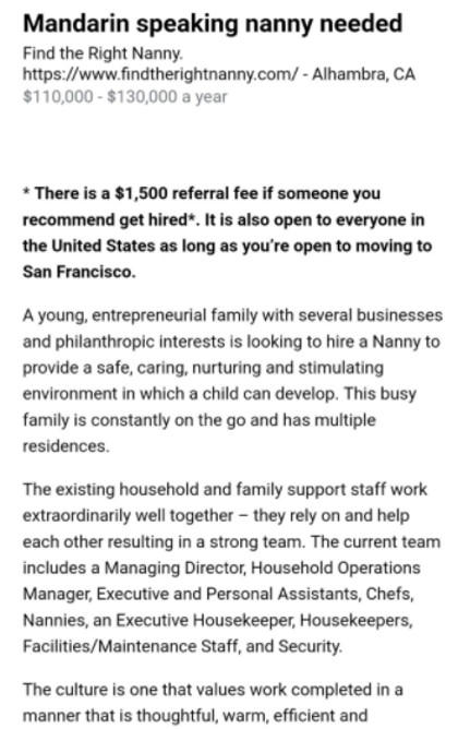 Một trang web tuyển dụng gần đây gây chú ý với thông tin tìm giúp việc được cho là của một người Trung Quốc và đang làm việc tại thung lũng Silicon, San Francisco, Mỹ.