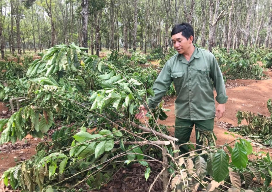 Qua kiểm tra, cơ quan chức năng xác định có 1.069 cây cà phê bị chặt phá nằm rải rác trong vườn cao su. Đây là những cây cà phê được người dân trồng khoảng 3 đến 5 năm nhưng kém phát triển vì ít được chăm sóc.