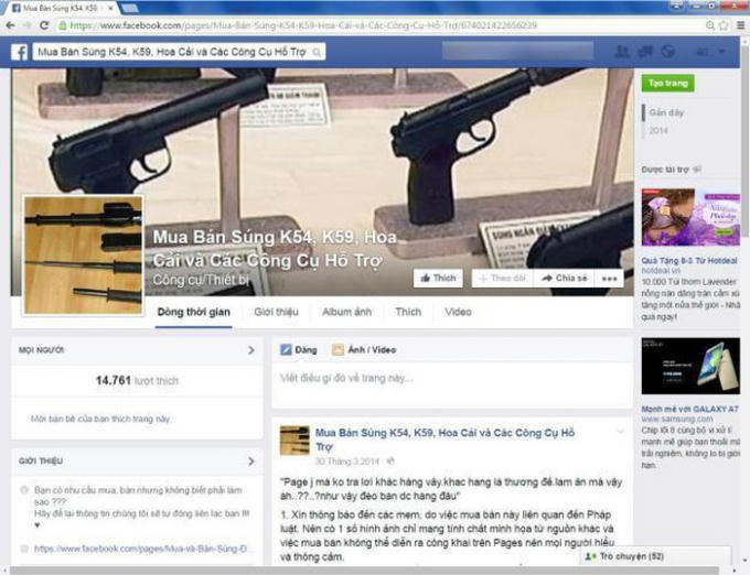 Điều đáng nói, các trang này đều có hàng ngàn lượt thích, ví dụ như “shop bán đồ tự vệ” có trên 1.700 lượt người thích; shop mua bán vũ khí nóng có trên 5.900 lượt thích. Các loại vũ khí được giới thiệu khá chi tiết bằng hình ảnh, từ chủng loại đến kích thước.