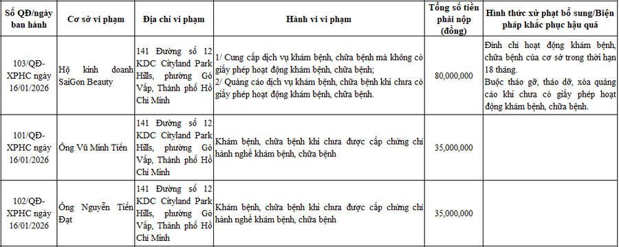 Bên cạnh đó, theo Quyết định Hộ kinh doanh SaiGon Beauty (địa chỉ 141 Đường số 12 KDC Cityland Park Hills, phường Gò Vấp, TP HCM) bị xử phạt 80 triệu đồng do cung cấp dịch vụ khám bệnh, chữa bệnh mà không có giấy phép hoạt động khám bệnh, chữa bệnh và quảng cáo dịch vụ khám bệnh, chữa bệnh khi chưa có giấy phép hoạt động khám bệnh, chữa bệnh.
