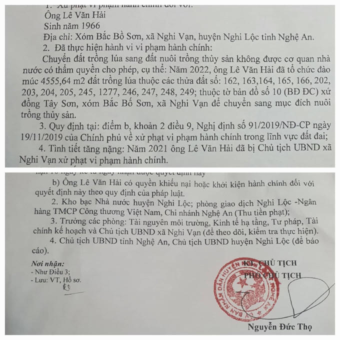 Nội dung quyết định nêu: xử phạt vi phạm hành chính đối với ông Lê Văn Hải, đã thực hiện hành vi chuyển đất trồng lúa sang đất nuôi trồng thủy sản không được các cơ quan thẩm quyền cho phép. Năm 2022, ông Hải đã tổ chức đào múc 4555,64m2 đất trồng lúa thuộc các thửa đất số: 162, 163, 164… thuộc tờ bản đồ số 10 xứ đồng Tây Sơn xóm Bắc Bố Sơn, xã Nghi Vạn để chuyển sang mục đích nuôi trồng thủy sản.