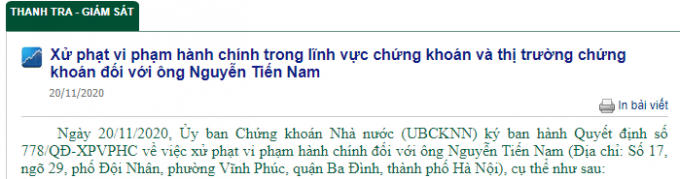 Ngày 20/11/2020, Ủy ban Chứng khoán Nhà nước (UBCKNN) đã ký ban hành quyết định xử phạt vi phạm hành chính đối với ông Nguyễn Tiến Nam (Địa chỉ: Số 17, ngõ 29, phố Đội Nhân, phường Vĩnh Phúc, quận Ba Đình, TP. Hà Nội).