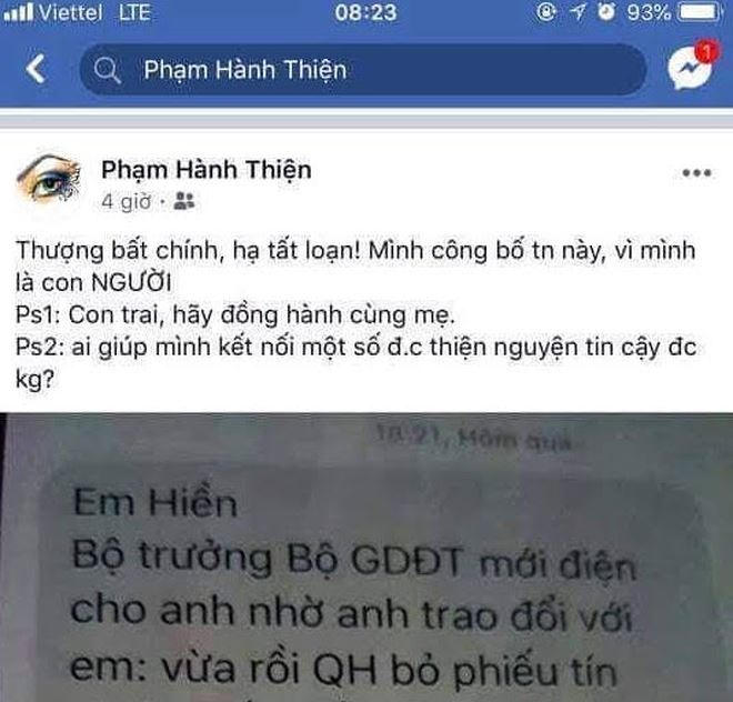 Mấy ngày qua, dư luận xã hội không khỏi xôn xao khi một nữ đại biểu Quốc hội của tỉnh Phú Yên đăng lên Facebook cá nhân một đoạn tin nhắn được cho là của một vị đại biểu Quốc hội khác nhờ bà không chất vấn Bộ trưởng Bộ Giáo dục và Đào tạo.
