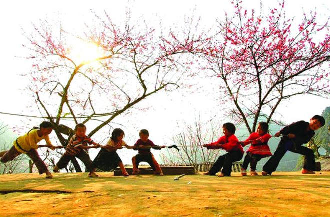 Trên khoảnh đất trống, từng đoàn trẻ con má hồng như táo chín, xúng xính váy áo mới tinh đang túm tụm chơi các trò chơi dân gian như kéo co, ném pao, nhảy lò cò… hoặc hát những câu đồng dao bằng tiếng dân tộc khiến không khí ngày tết càng thêm tưng bừng néo nhiệt…