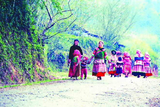 Trên những con đường khấp khểnh đá tai mèo, mấy thiếu nữ tóc thề nhuộm màu thời trang sóng sánh bờ vai trong trang phục váy xòe rực rỡ sắc màu, ánh mắt e ấp trước cái nhìn như táp lửa của nhóm trai bản đang biểu diễn điệu khèn réo rắt xuân tình.