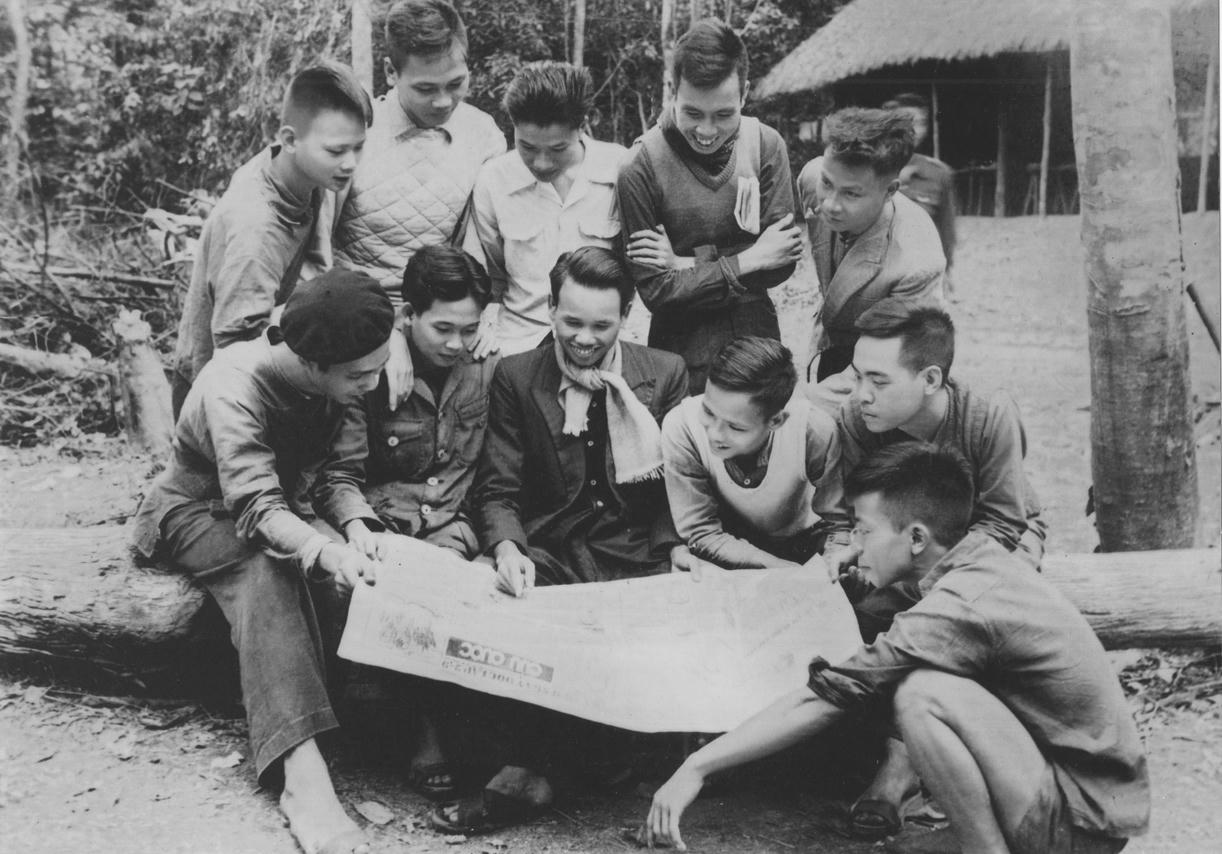 Chủ nhiệm Xuân Thủy (quàng khăn) cùng các đồng nghiệp báo Cứu Quốc tại đèo Bụt, Bắc Giang, năm 1948.(Nguồn: Bảo tàng Báo chí Việt Nam).