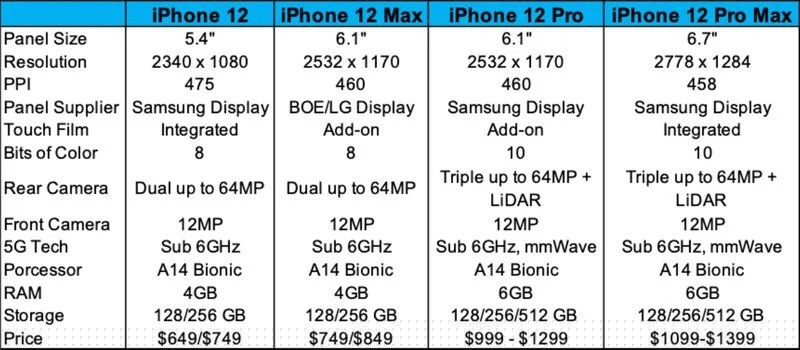 Theo nguồn tin, phiên bản này sẽ hỗ trợ công nghệ Y-OCTA, màu 10 bit và XDR. Giống như iPhone 12 Pro, iPhone 12 Pro Max cũng có thể có tốc độ làm tươi 120Hz, nhưng cũng không có LTPO.Bên cạnh đó, nguồn tin cũng tiết lộ rằng loạt iPhone 12 sắp tới sẽ trang bị chip xử lý A14 Bionic, RAM 4GB và camera selfie 12MP. Hai phiên bản iPhone 12 và iPhone 12 Max sẽ có hệ thống camera kép độ phân giải 64MP cùng hai tùy chọn bộ nhớ là 128/256GB. Trong khi đó, hai phiên bản iPhone 12 Pro và iPhone 12 Pro Max sẽ có hệ thống 3 camera phía sau, độ phân giải 64MP và bổ sung thêm tùy chọn bộ nhớ 512GB.
