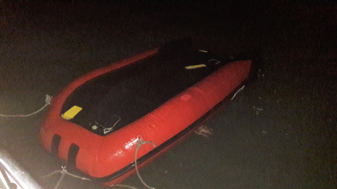 | Chiếc xuồng cao su bị lật úp trên biển. |