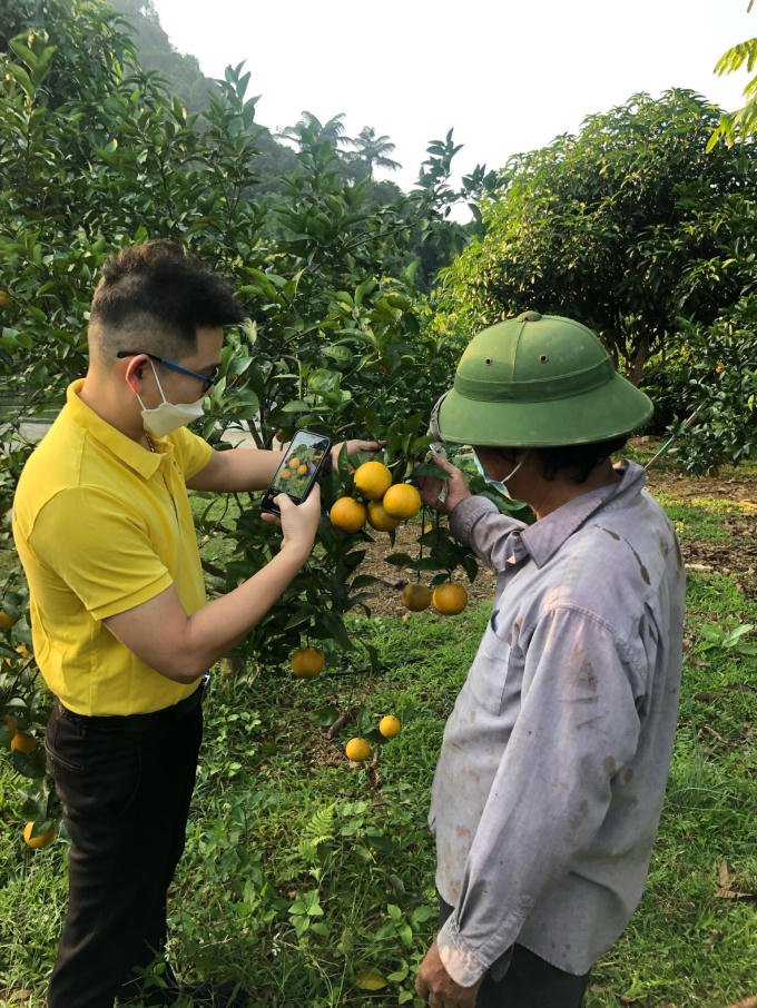 Cán bộ ngành Bưu điện tỉnh Yên Bái xuống cơ sở hỗ trợ bà con đưa sản phẩm OCOP Cam Sành Lục Yên lên sàn thương mại điện tử.