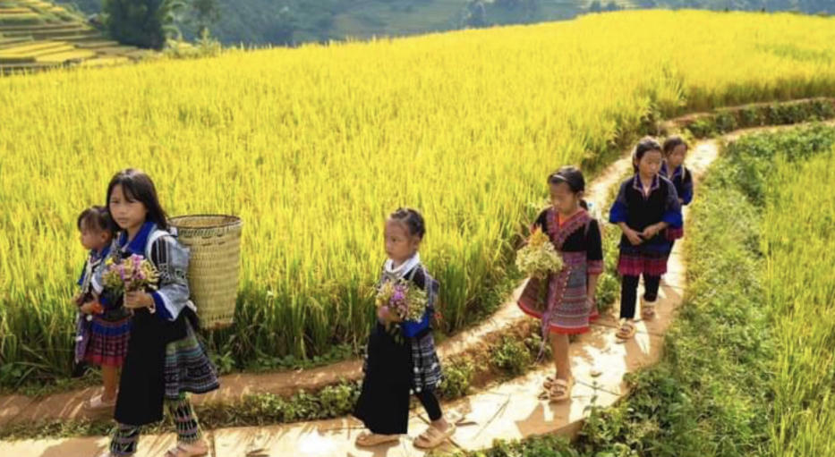 Trẻ em người Mông đi học vào ánh bình minh.