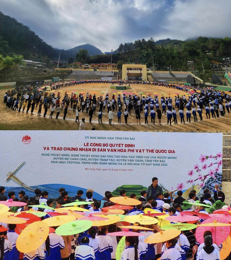 Tỉnh Yên Bái đã chuẩn bị Lễ công bố quyết định và trao chứng nhận di sản văn hóa phi vật thể quốc gia nghệ thuật Khèn Mông. Nghệ thuật dùng sáp ong để tạo hoa văn trên vải của người Mông huyện Mù Cang Chải, Trạm Tấu, Văn Chấn tỉnh Yên Bái.Khai mạc chương trình vào ngày 23/12.