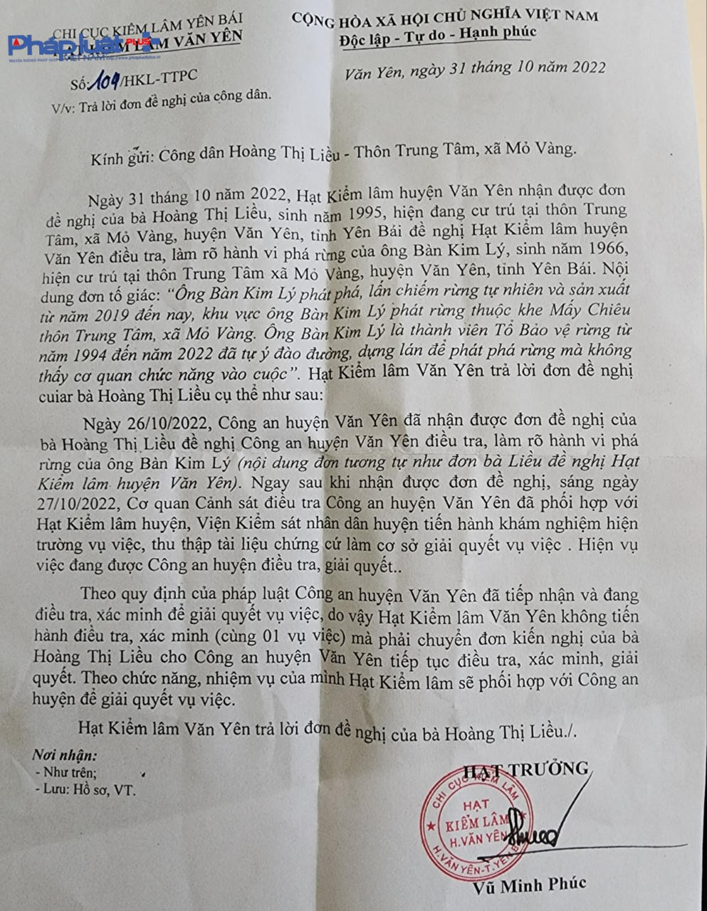 Hạt Kiểm lâm huyện Văn Yên trả lời đơn công dân.