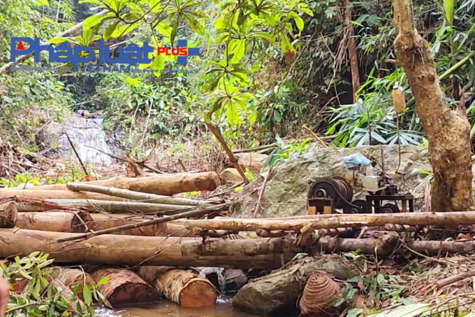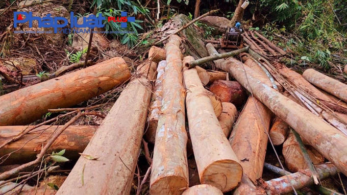 Gỗ rừng tự nhiên bị khai thác hàng chục m3 được bỏ lại trong rừng.