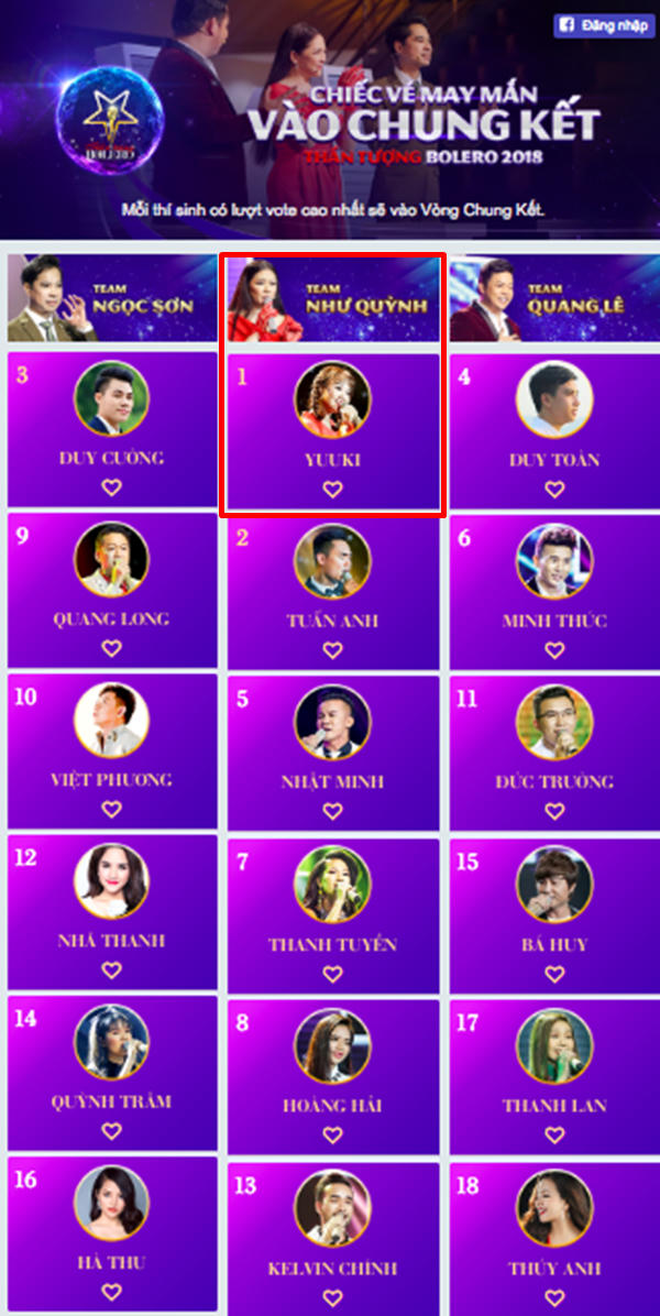 Kết quả cuộc bình chọn Chiếc vé may mắn đã chính thức được công bố: Yuuki Ánh Bùi là thí sinh dẫn đầu về lượng vote và nắm lấy cơ hội quay trở lại đường đua trong đêm chung kết. Như vậy, đêm thi cuối cùng của Thần tượng Bolero 2018 vẫn có sự góp mặt và tranh tài của dại diện đến từ 3 đội Như Quỳnh, Quang Lê và Ngọc Sơn.